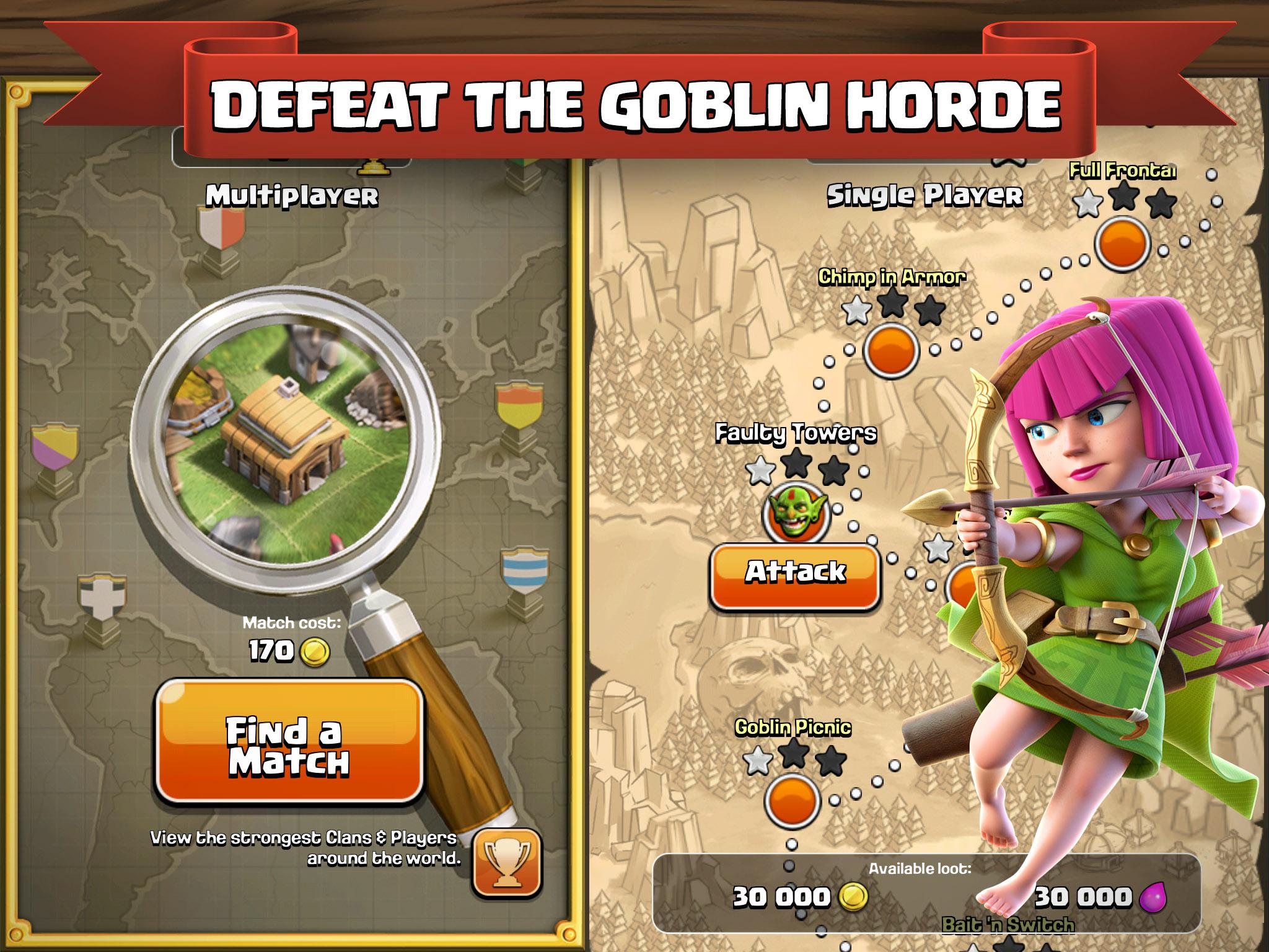 From rage-filled Barbarians with glorious mustaches to pyromaniac wizards, raise your own army and lead your clan to victory! Build your village to fend off raiders, battle against millions of players worldwide, and forge a powerful clan with others to destroy enemy clans.