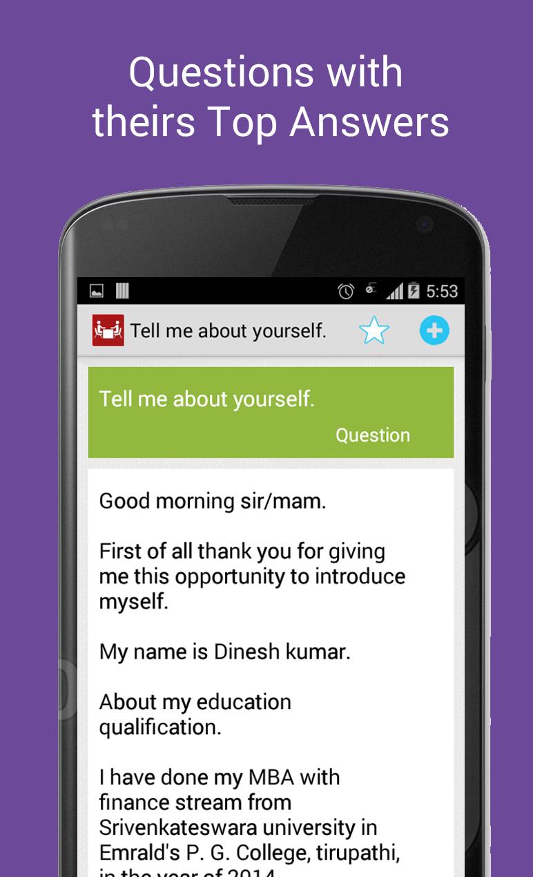 This application contains top asked interview questions, all questions and answers are based on 100+ companies interview and 300+ students, we have compiled only best answers. Apart from interview questions this application also have more than 500 most discussed group discussion questions.